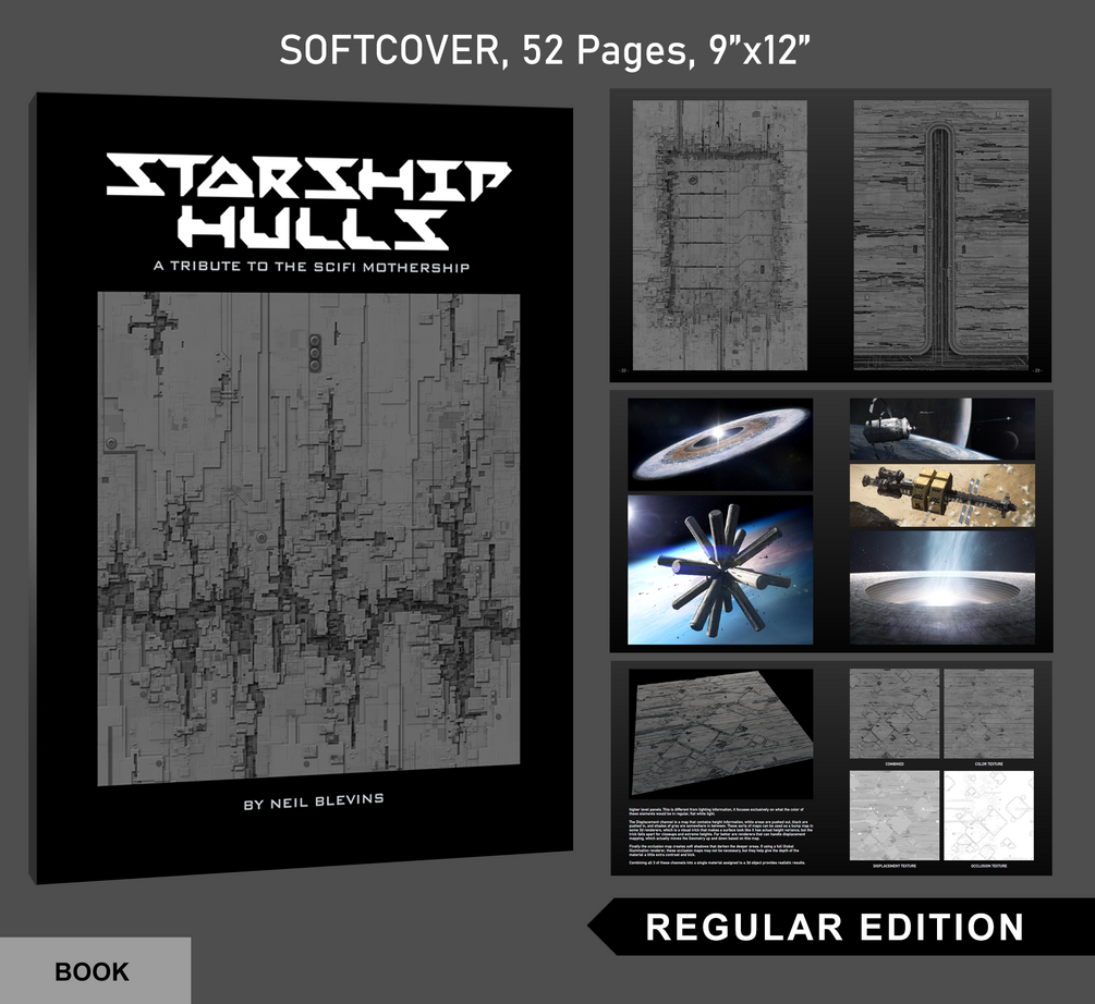A beautiful companion to the book "Megastructures: The Visual Encyclopedia", "Starship Hulls: A Tribute To The Scifi Mothership" is a 52 page softcover book that contains development artwork from the Megastructures project (including all 20 of the popular Starship Hull test images from Neil Blevins), as well as 3 never before published Megastructure paintings. Finally, for the artists in the crowd, the book contains links to 2+ hours of video tutorials showing the techniques for making your own starship hulls in photoshop.