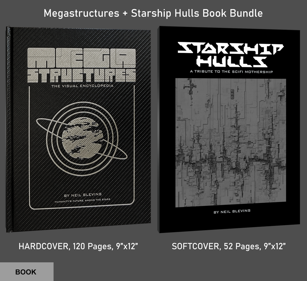 This is a special bundle of both "Megastructures: The Visual Encyclopedia" and "Starship Hulls: A Tribute To The Scifi Mothership" physical books.